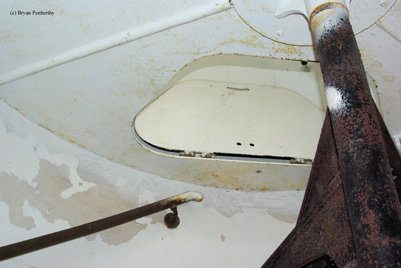 - Looking down through hatch to spiral stair case.