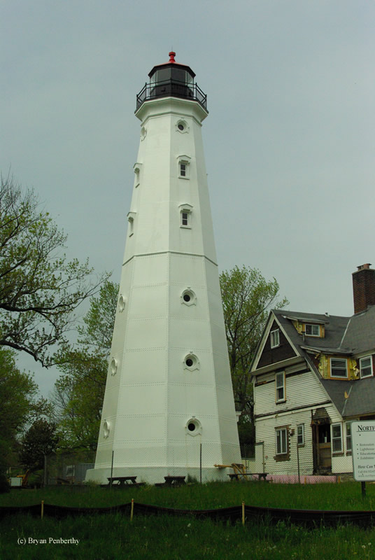 - Side of the lighthouse showing the original and new halves of the tower.