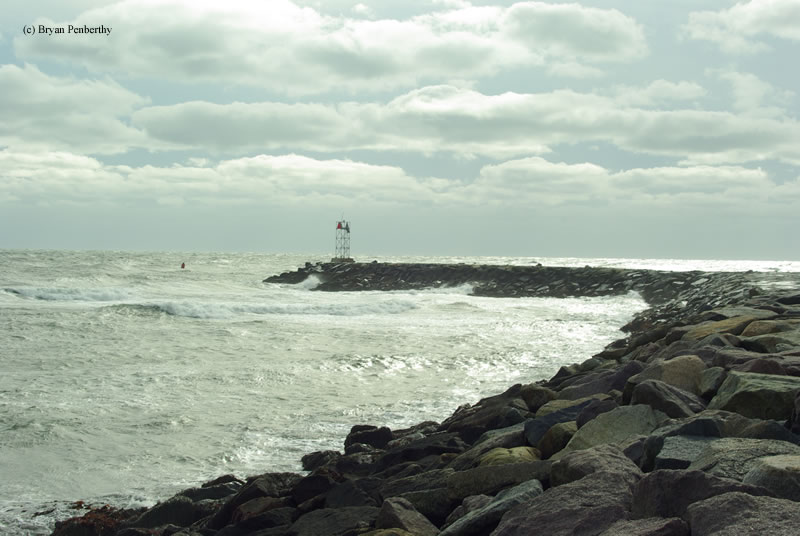 - Waves pound the breakwall.