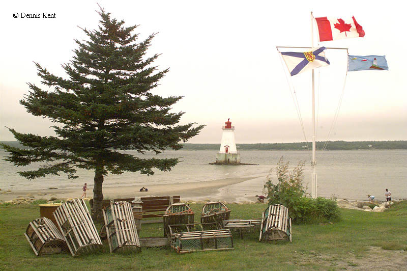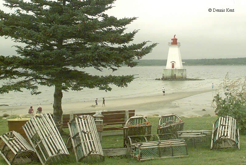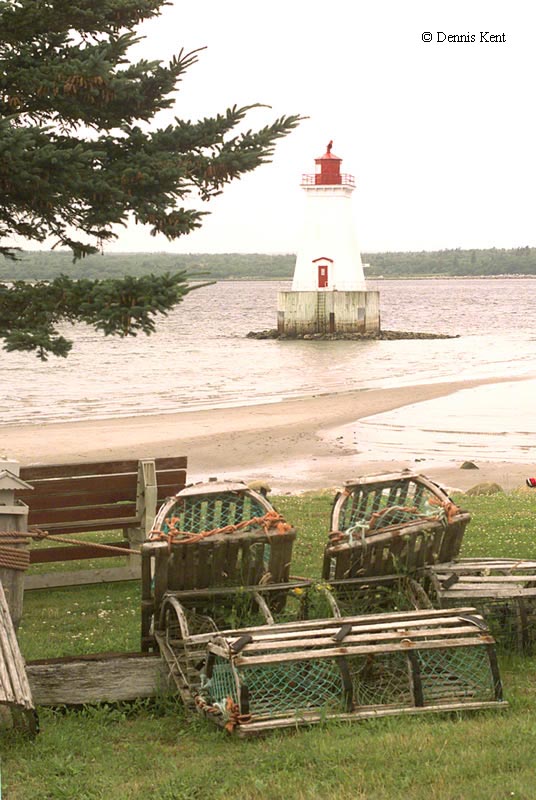 - Lobster traps are for decoration. Sandy Point Lighthouse in the background.